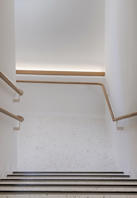 Das kleinere Gebäude wird in Situ und Proportion von einem Neubau ersetzt. So finden in ursprünglicher städtebaulicher Setzung ein modernisierter massiver Ziegelbau und ein monolithischer neuer Ziegelbau wieder zueinander - bilden lesbaren Stadtraum mit Geschichte. Im Neubau finden sich die Aufenthaltsräume der Kinder wieder, im Altbau die dienenden Räume.