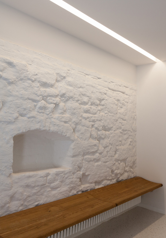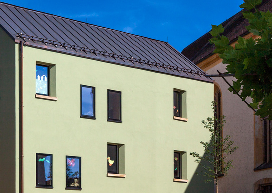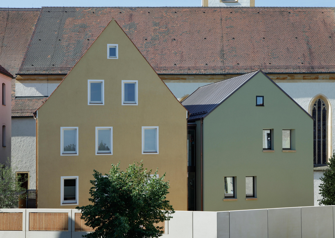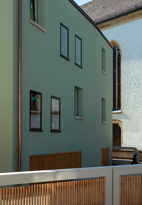 Die Materialsprache zeigt Neues und offenbart Altes - zeigt sich als Zeitreise, hinterlässt Fragen und bietet Lösungen. Die Oberpfälzer Typologie der Kargheit und der Einfachheit einer Lochfassade spiegelt die Anforderungen der "kleinen" Nutzer wieder. Die Kirche als Nachbar wirkt in den Innenraum und schafft mit den beiden einfachen Häusern einen besonderen Ort.