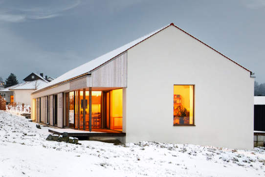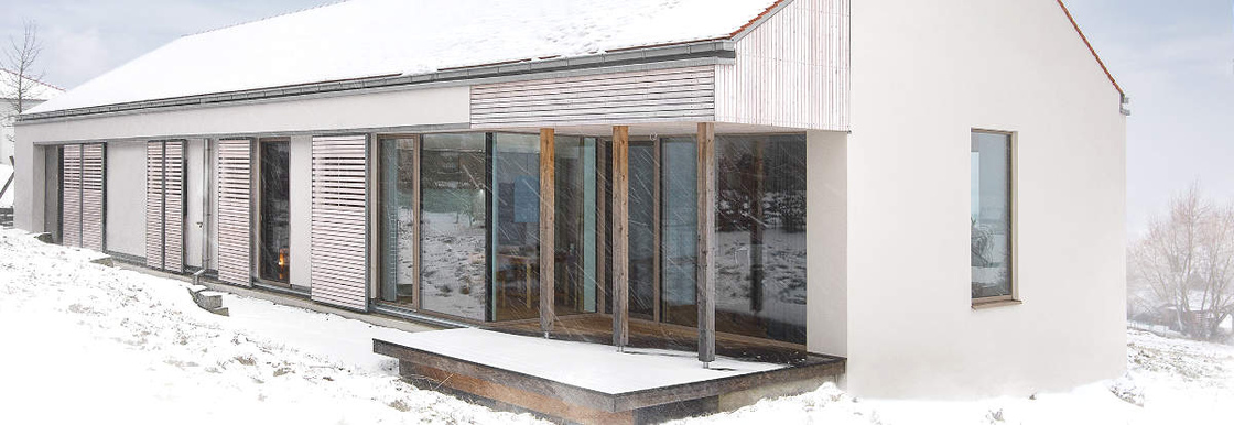 Die Oberpfälzer Bautradition findet ihre Fortsetzung mit dem einfachen Biberschwanzsatteldach, dem knappen Ortgang und den Schiebeläden, die Sonnen- und Sichtschutz sicherstellen. Das Haus bettet sich in den Hang ein, verzichtet auf Zäune und übernimmt im Garten regionale Bepflanzungen.